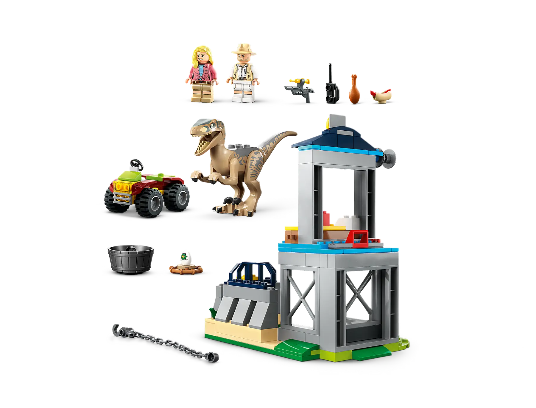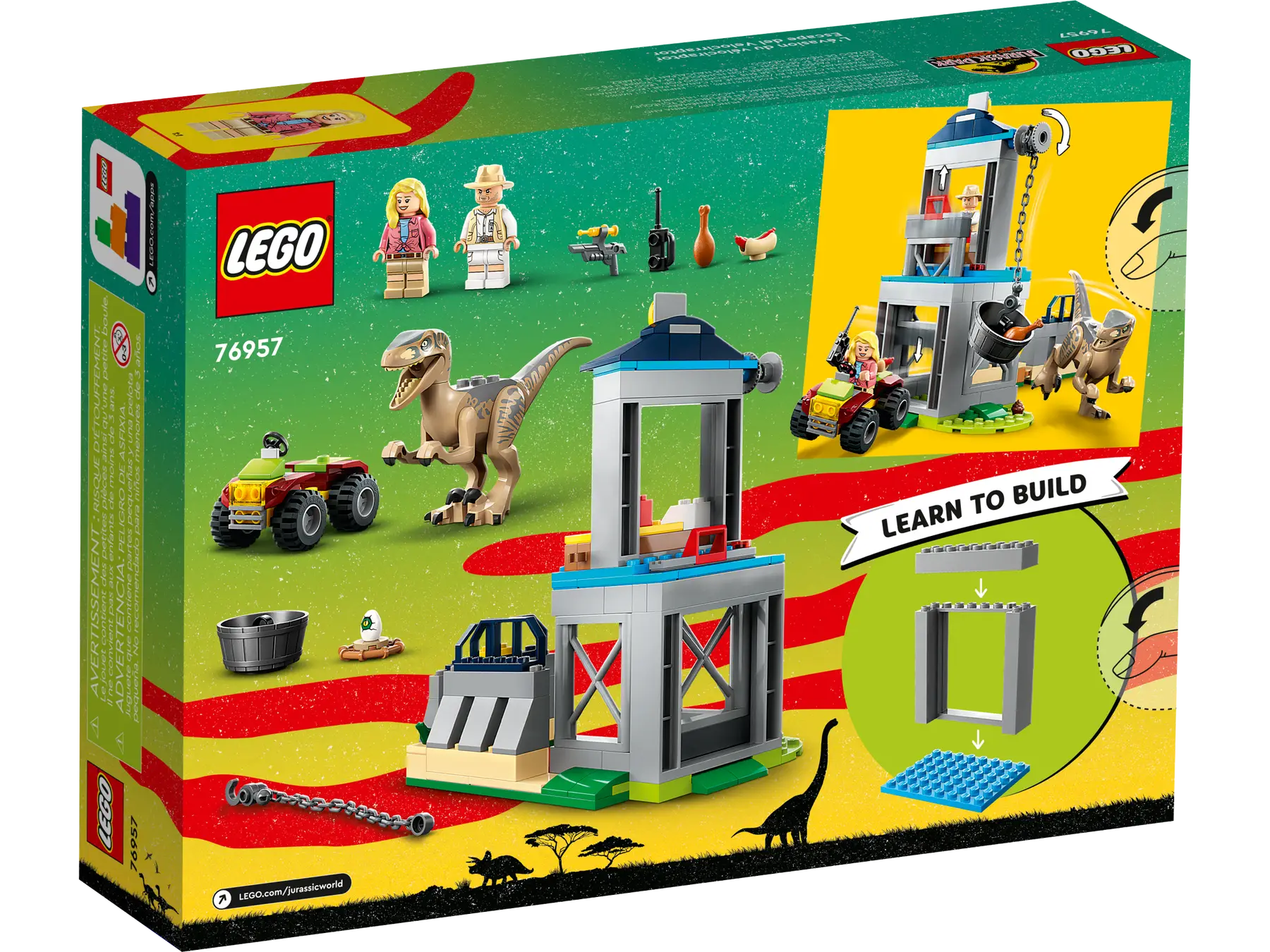 - Startovací sada – seznamte děti od čtyř let se stavebnicemi LEGO® Jurský svět s LEGO® Útěk velociraptora (76957), ve kterém je pohyblivá figurka velociraptora, dinosauří ohrada a terénní vůz